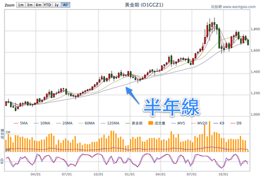 昨天又一次跌破半年線,如果照慣例的話,今天會漲回半年線反彈向上,如果還是續跌不變,代表這次的下跌改變了過去這兩年穩定向上的趨勢,手中持有比較多黃金的朋友就要小心點。