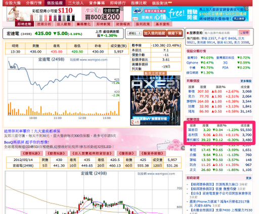 看宏達電(2498),右邊框框的地方就是在美國上市的手機類股,諾基亞、易利信和摩托羅拉,當然這是程式自己去跑的,難免會有遺漏,但是對一般使用上來說方便不少。